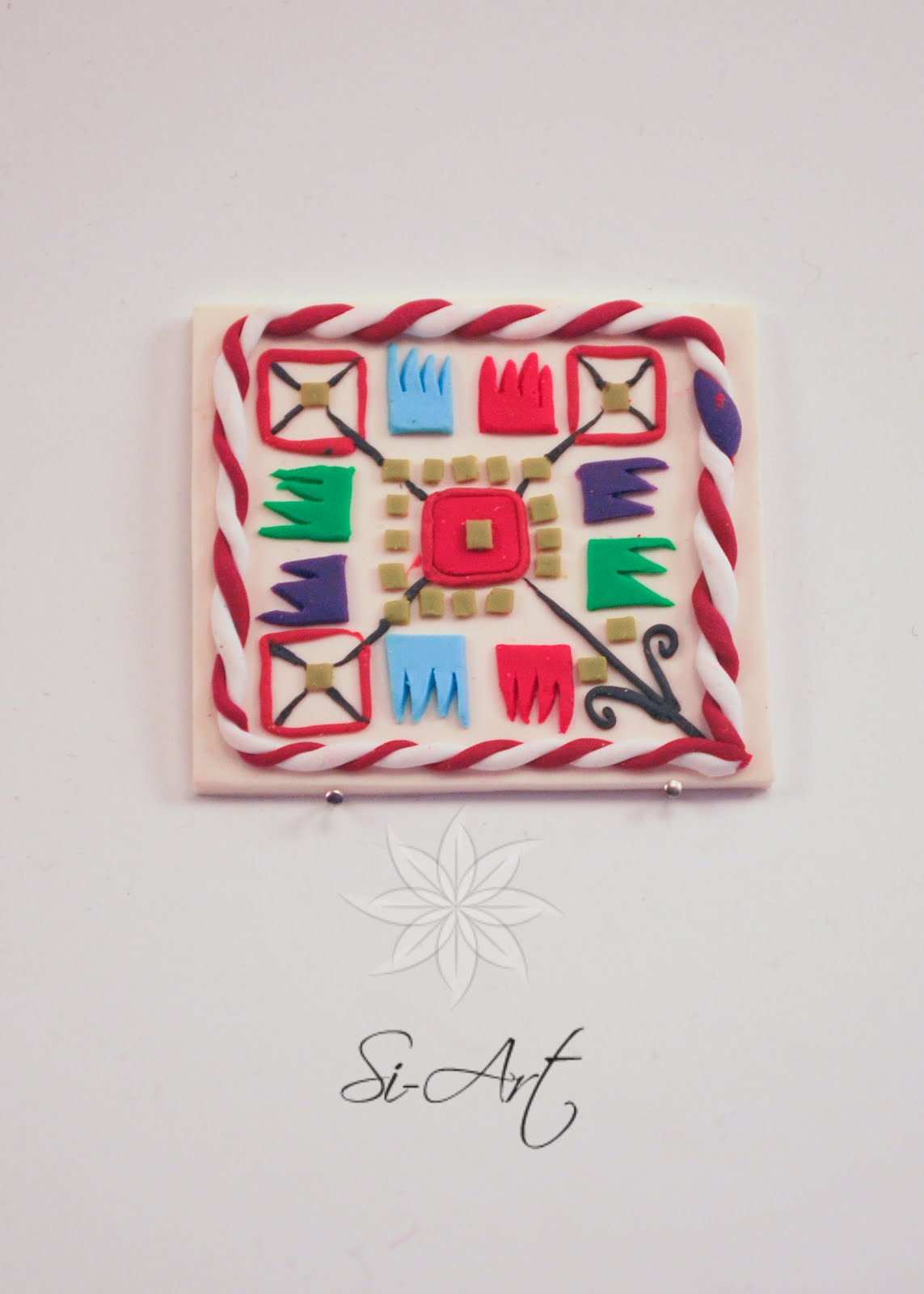 Anastasia Veleva е творец,които вижда в полимерната глина средство за запазване и дообогатяване на българското културно наследство.Вдъхновена от фолклора авторката започва да изработва серия полимерни плочки,реплики на български шевици.Anastasia поднася детайла от шевицата по изчистен,съвременен начин,като използва актуалният графичен рисунък.Изделието може да стои ефектно и като аксесоар и като изделие за декора.Една българска стилизирана етно закачка.И във същото време със вложеният в нея традиционен смисъл.Като на изделието от снимката.То представлява част от растителна елбетица, което е символ на хармонията в света и в човешкото поведение. Още две колоритни изделия от серията на Anastasia Veleva може да видите ето тук и тук.